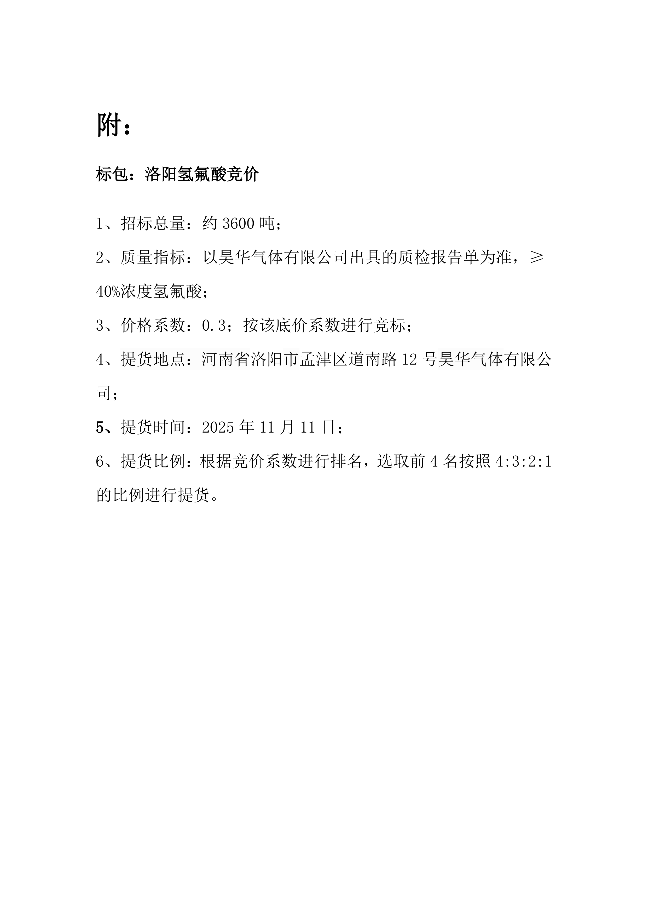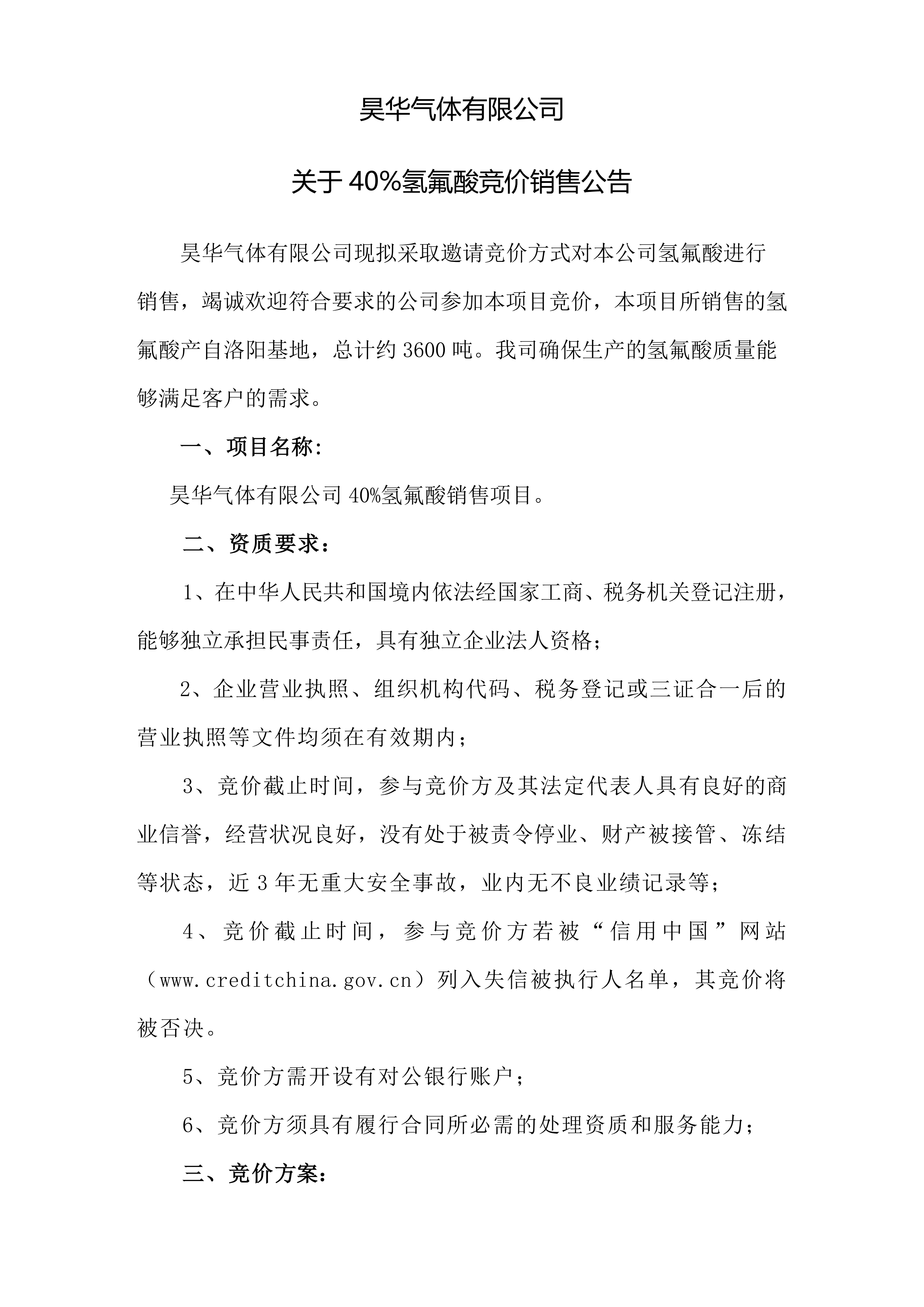 昊华气体有限公司关于 40%氢氟酸竞价销售公告