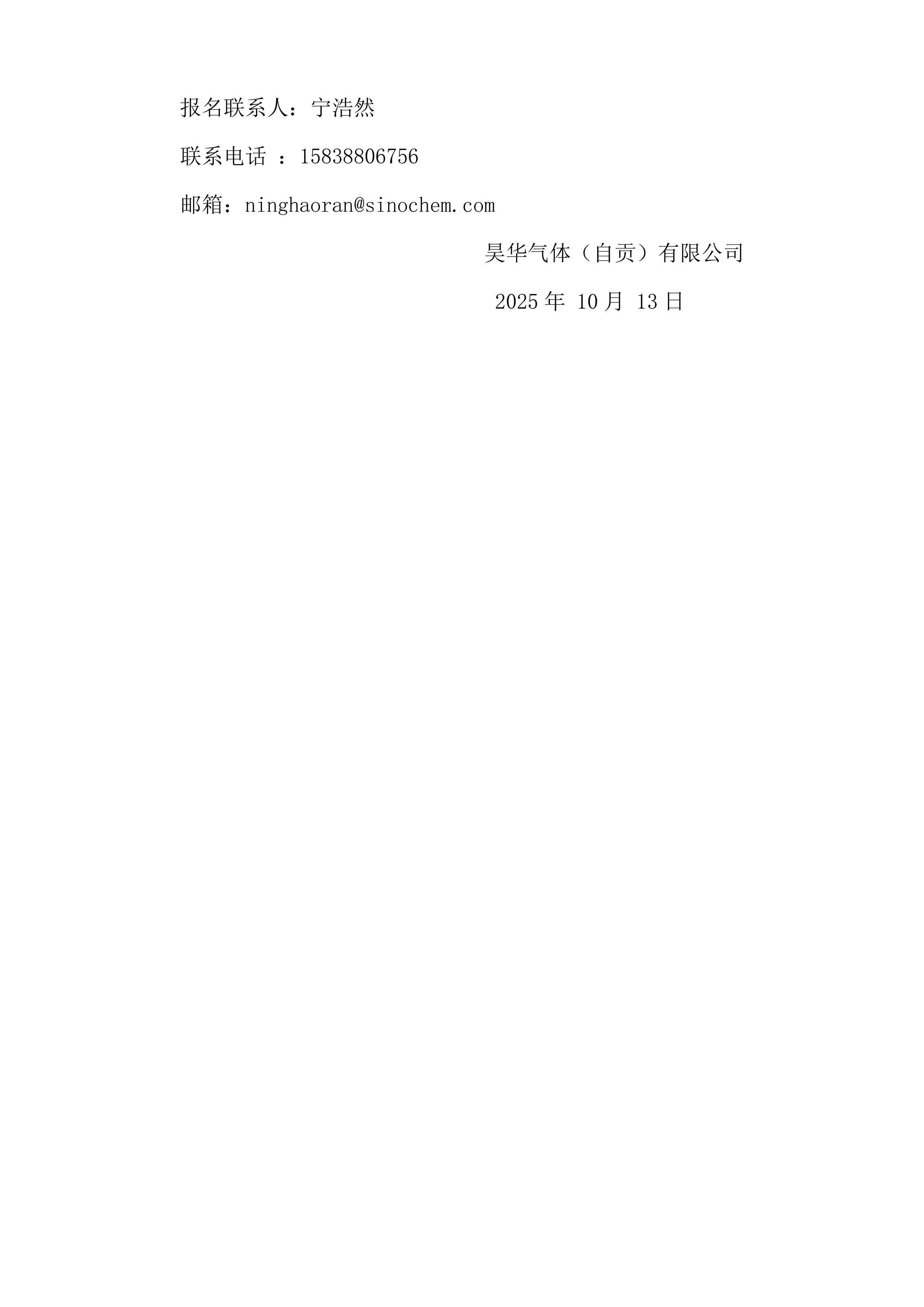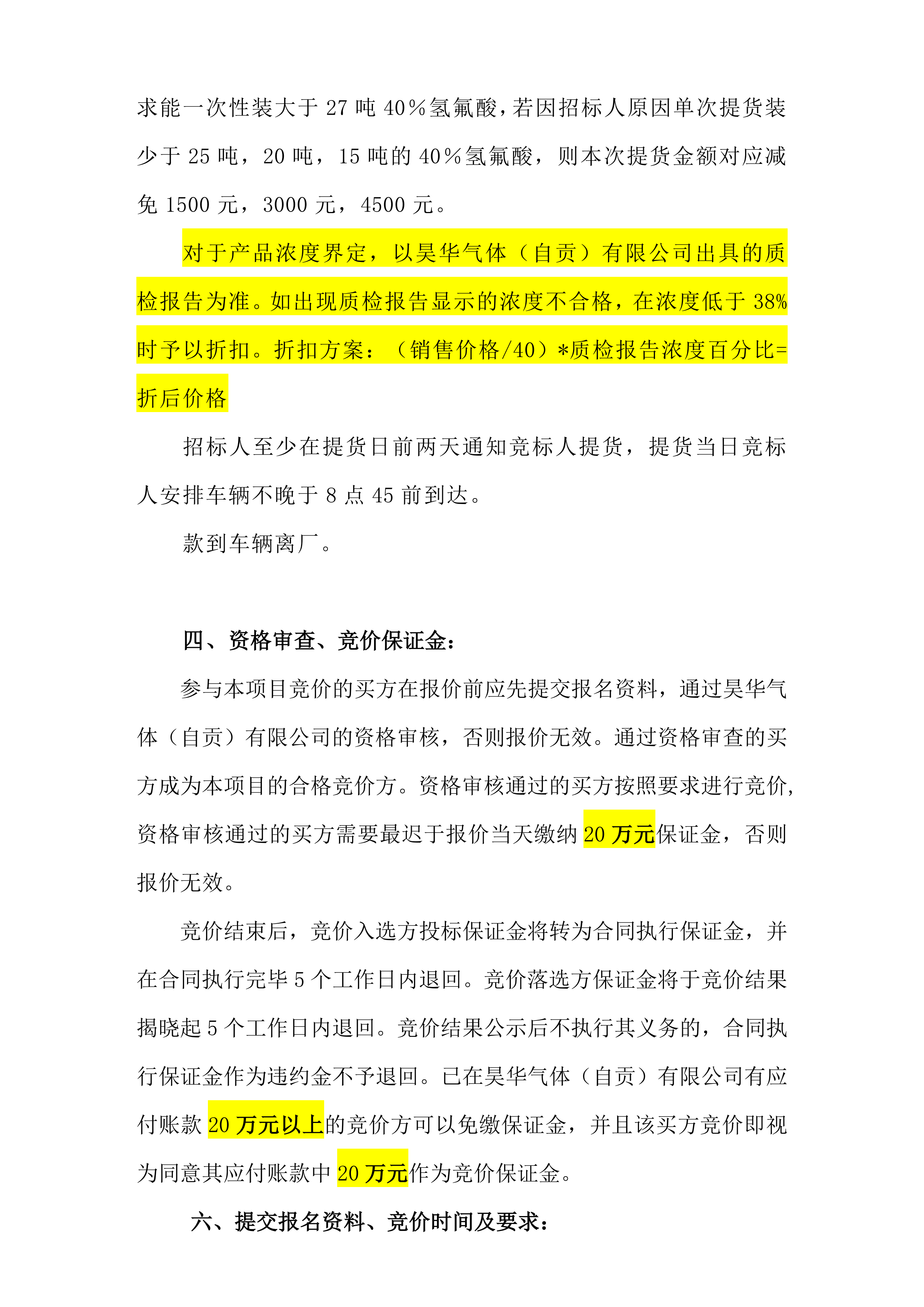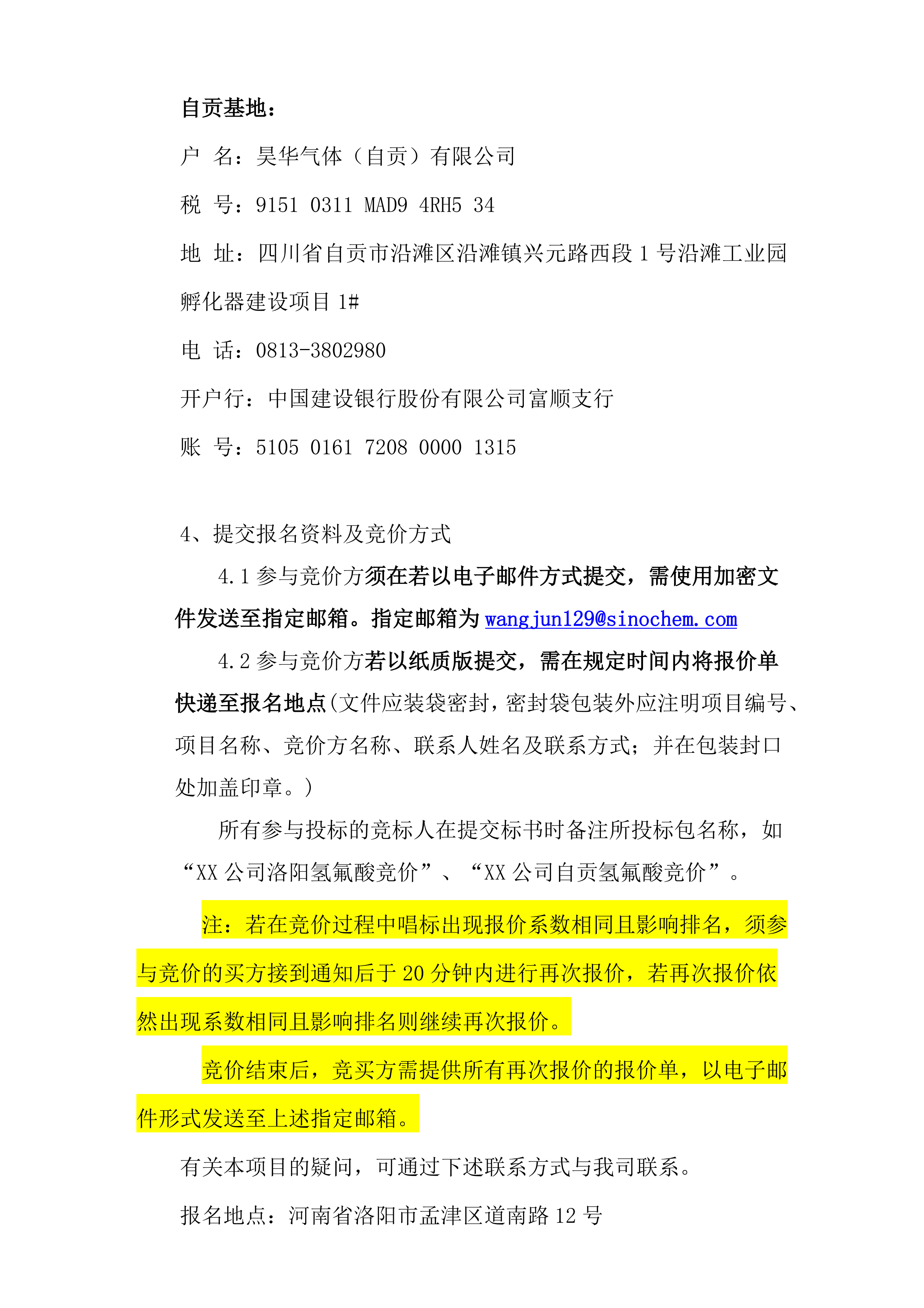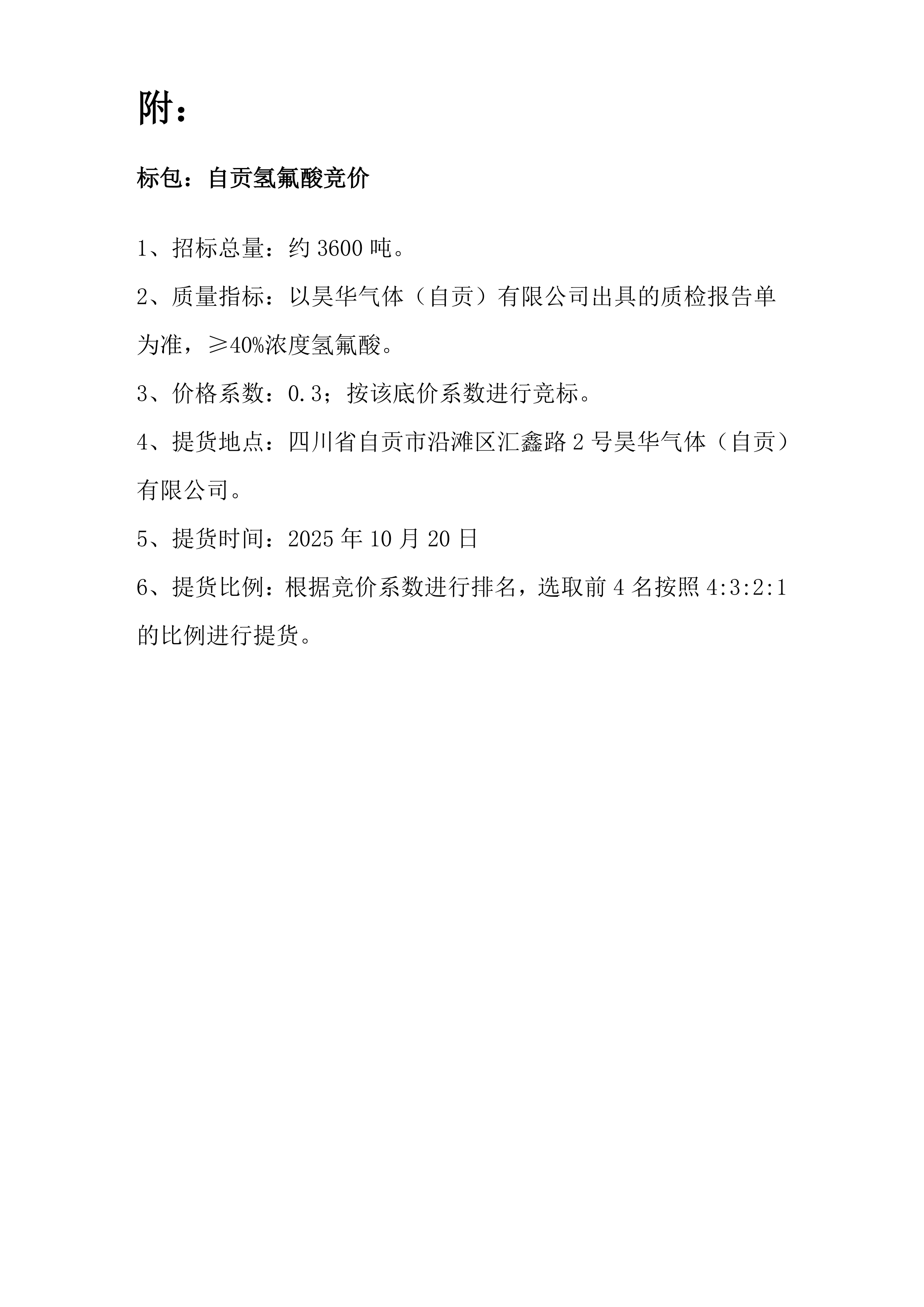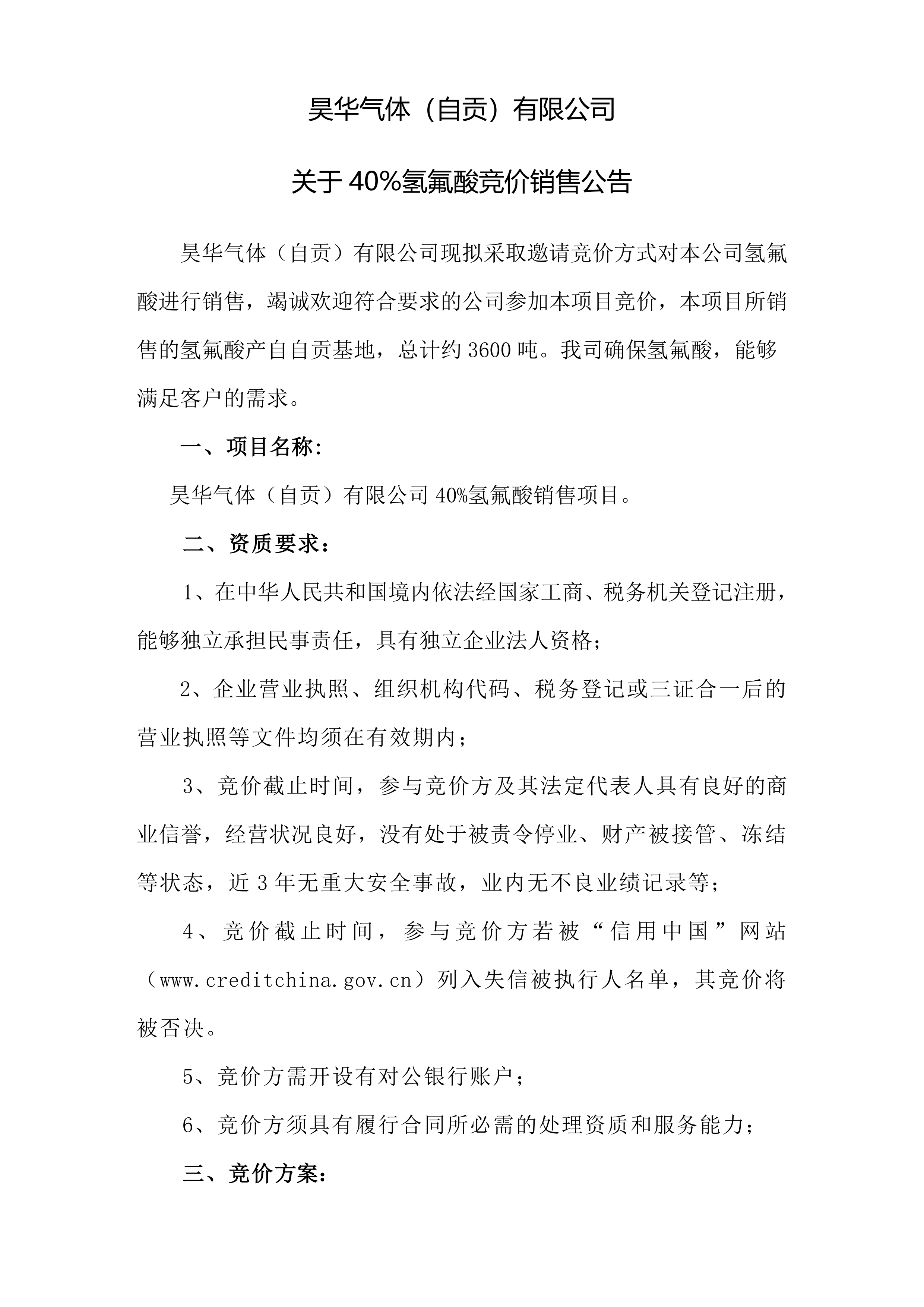 昊华气体(自贡)有限公司关于 40%氢氟酸竞价销售公告